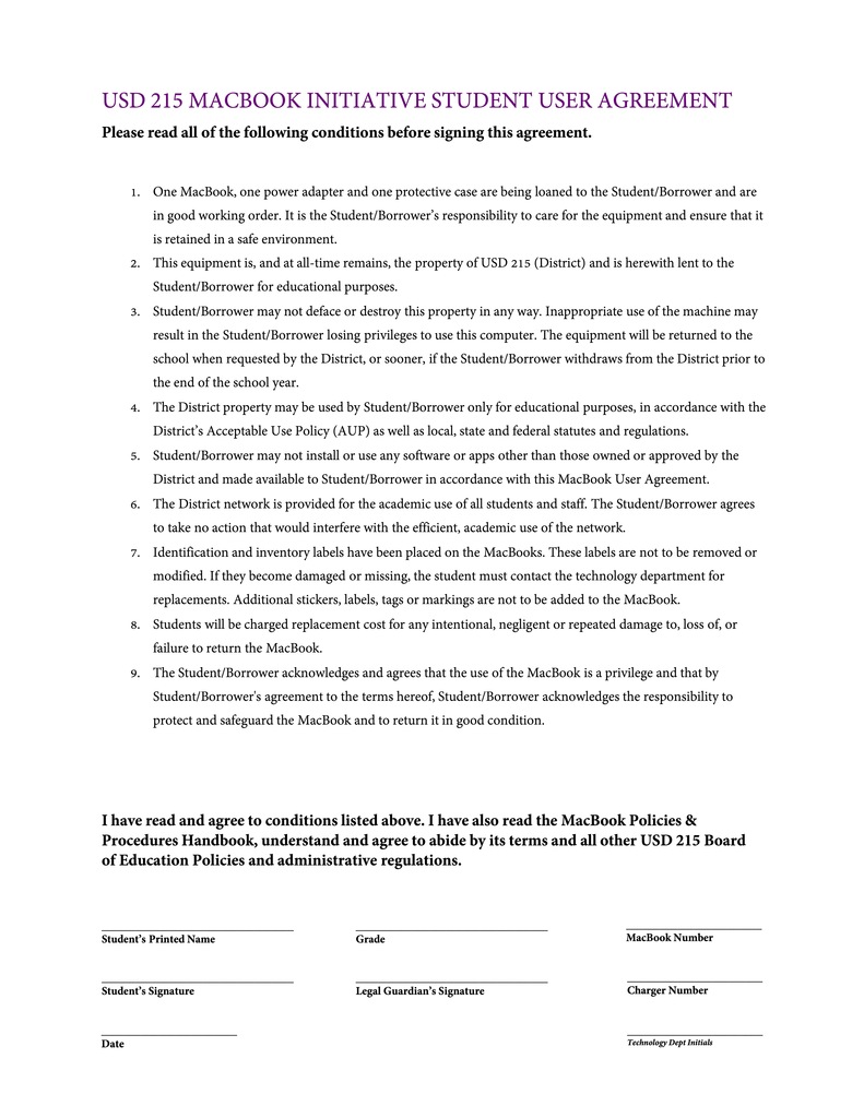 High School students: MacBook check out will be August 8th from 9:00AM-3:00PM in the Academic Building. The MacBook User Agreement MUST be signed by yourself and a guardian before receiving a MacBook. You may print out and sign the form ahead of time by going to this link https://5il.co/1ee2a and bring it with you when checking out your MacBook.