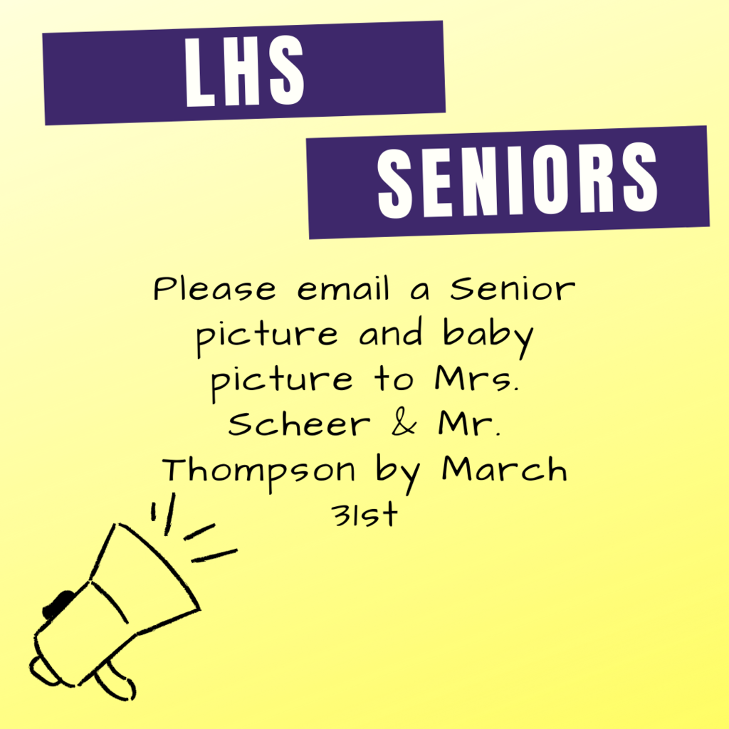 Seniors, please send a baby and Senior picture to Mrs. Scheer & Mr. Thompson. These will be for senior shout-outs, yearbook, and the senior slideshow! Thank you!